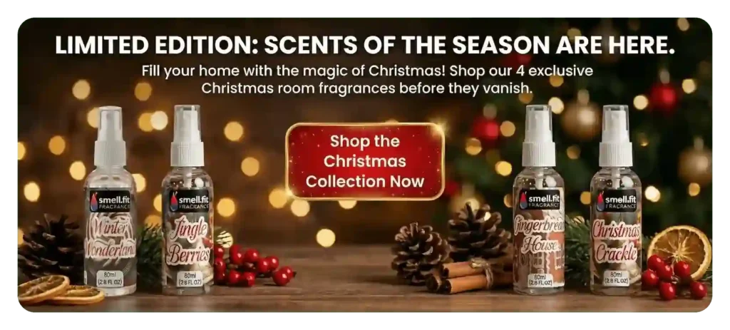 Hero banner for Smell.Fit's rewards program. Black and purple design. Text reads: 'Unlock Exclusive Rewards with Smell.Fit!' The banner highlights four perks: 100 points for signing up, 40 points for every item ordered, spin the wheel monthly (up to 300 points), and 1000 points on your birthday, plus 'And more!'.